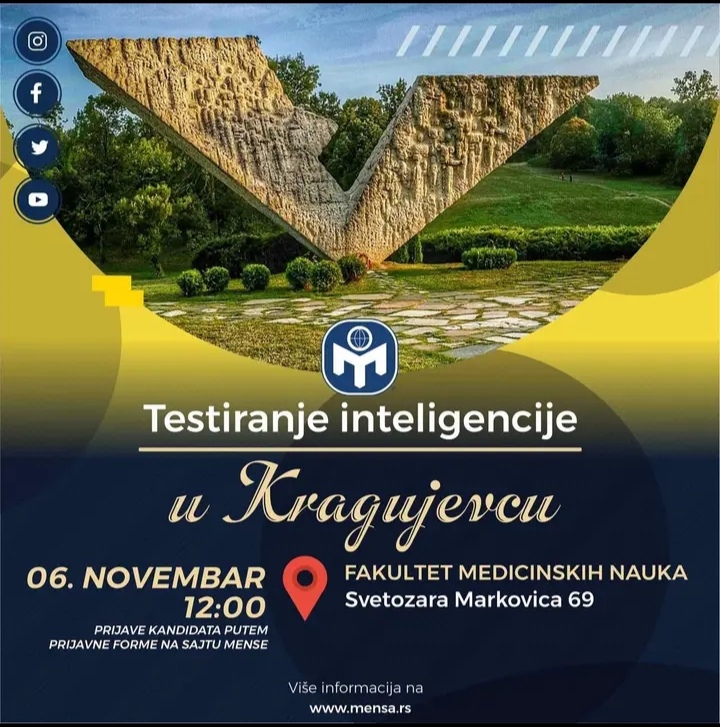 Udruženje Mensa organizovaće u nedelju, 6. novembra, od 12 časova testiranje inteligencije u velikoj sali Fakulteta medicinskih nauka u Kragujevcu.