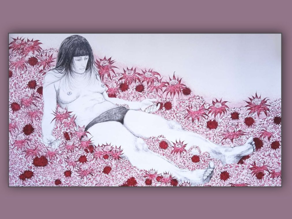 Ženska figura u kriznim stanjima je glavna tematika izloženih radova, ali transgresija nije samo likovni motiv, već i efekat kojem svako zasebno delo teži. Ovi prikazi snažnog, često neprijatnog, bolnog somatskog iskustva pojačani su svojstvenim poigravanjem vremenskom dimenzijom. Pravila igre su nizanje beskonačnih, zamrznutih trenutaka, u hronološki tok koji se može pratiti kroz sukcesiju crteža sa jedne strane, i beskonačno ritmično ponavljanje vremenskog intervala u animacijama sa druge strane. Manipulacija vremenom metod je oneobičavanja doživljenog, što otvara vrata u domen psihe. U tom prostoru, propadljivost tela postaje okidač za kompleksne odnose fizičkog i psihičkog. Iako je istraživanju odnosa trošnog tela i nesmirenog duha pristupljeno iz domena ženskog iskustva, figure Ive Dimitrijević odbijaju portretsko i lično. Izvor prikazanih akterki leži u iskustvu umetnice, ali kroz specifičnu analizu razine unutrašnjeg i spoljašnjeg otvara se mogućnost da žensko telo bude označitelj univerzalnog ljudskog iskustva. Figure odlikuju stoički izrazi lica u susretu sa instrumentima transgresije poput trnja, brijača i krvi. Cilj je potpuna deindividualizacija, batajevska težnja ka potpunosti u iskustvu prekoračenja granica bića, izrazita strast ka blistavom rasplinuću u totalitetu.