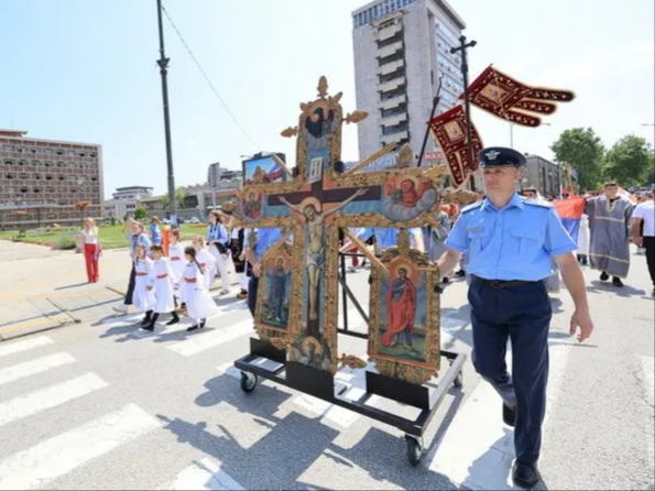 Po završetku liturgije, ulicama grada je krenula svečana litija sa moštima svetitelja. Krsni hod se kretao trasom preko Zastavinog mosta, Lepeničkim bulevarom, Višnjićevom ulicom do Trga kod Krsta, gde je uznesena zajednička molitva za mir, ljubav i napredak svih građana. Nakon toga, litija je nastavljena ulicama Save Kovačevića, dr Zorana Đinđića, Nikole Pašića i 27. marta, da bi se u povratku vratila u portu crkve, gde je priređen prigodan kulturno umetnički program.