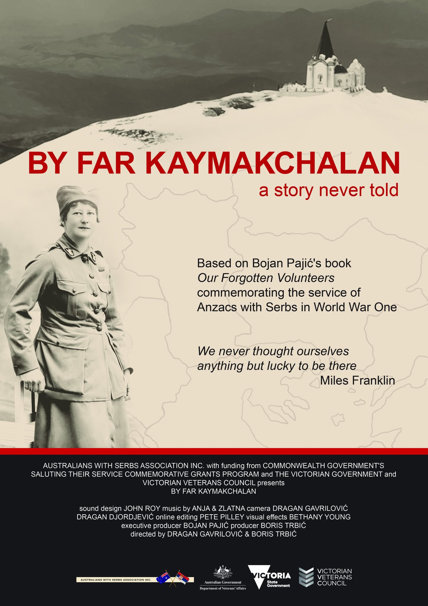 Sniman u Australiji, Srbiji, Grčkoj i Severnoj Makedoniji, film „Kajmakčalan“ (Australija / 2025. / 60’) govori o šestoro Australijanaca: doktorki Meri De Garis, bolničarki Etel Gilingam, spisateljici Steli Majls Frenklin, ćerki poznatog sidnejskog magnata Oliv King, kao i vojnicima Najlu Malarkiju i Edvardu Remidžu, koji su služili sa srpskim snagama na Solunskom frontu.